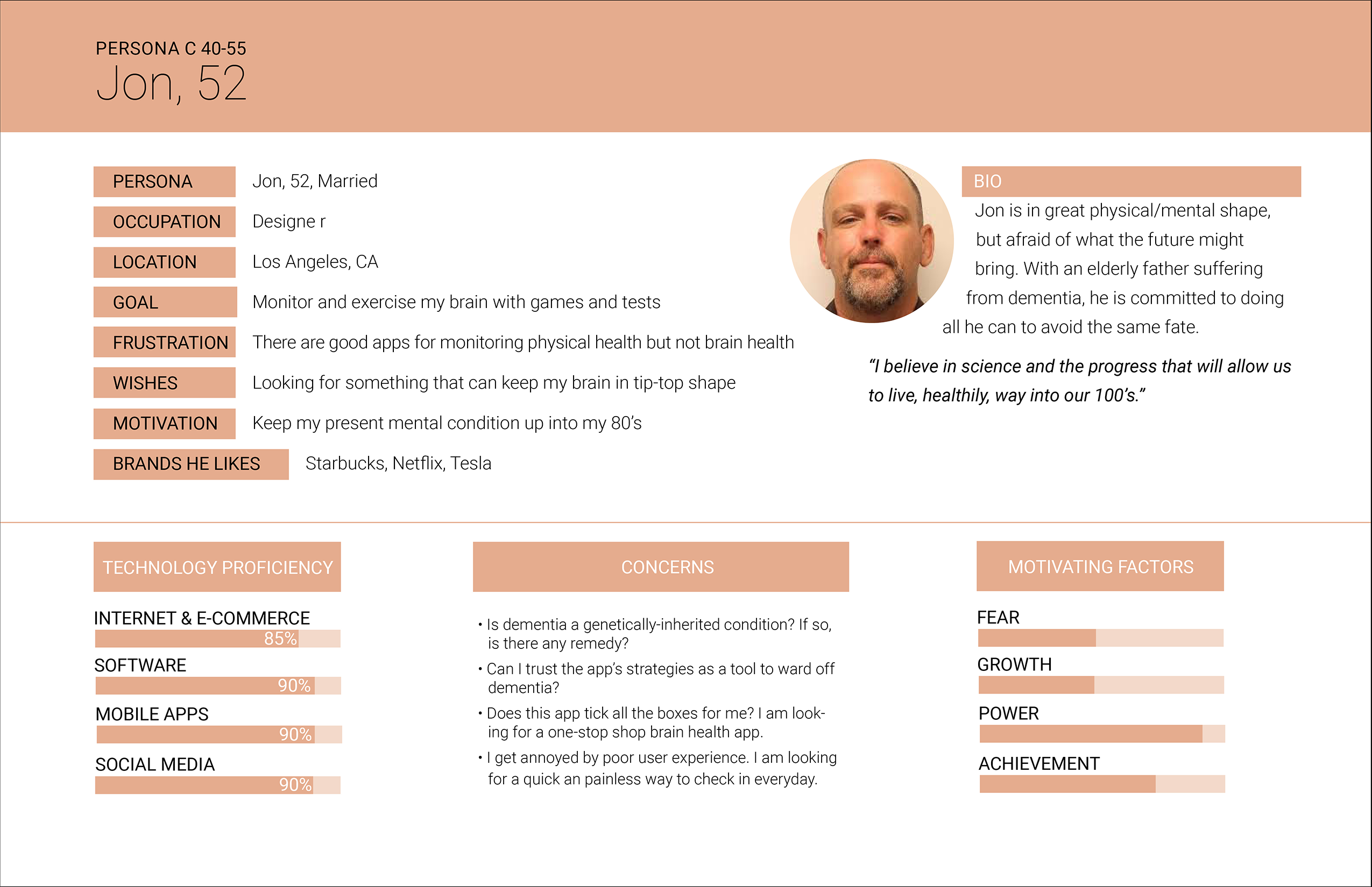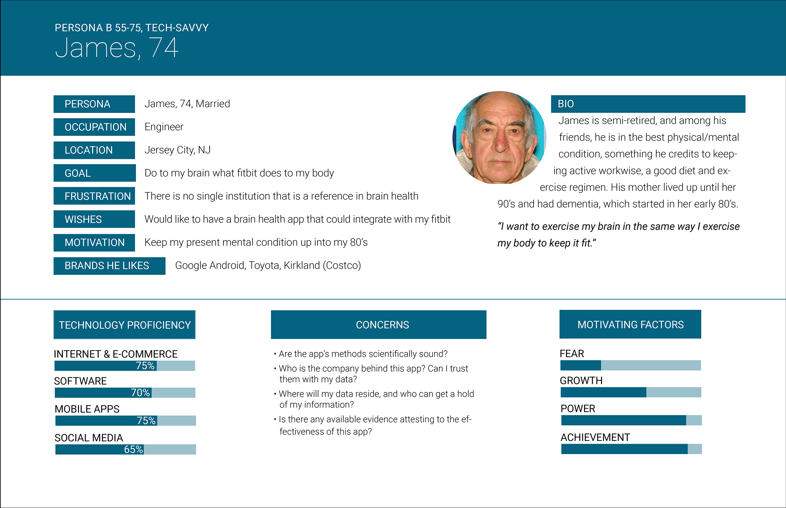 TARGET AUDIENCE | Directed to users diagnosed with early-stage dementia and/or Alzheimer disease, the app is designed to continuously measure the user’s cognitive health in order to provide a clearer, more accurate picture of the disease’s progress than could be achieved in bi-annual administrations of cognitive tests at consultations with their Neurologist.