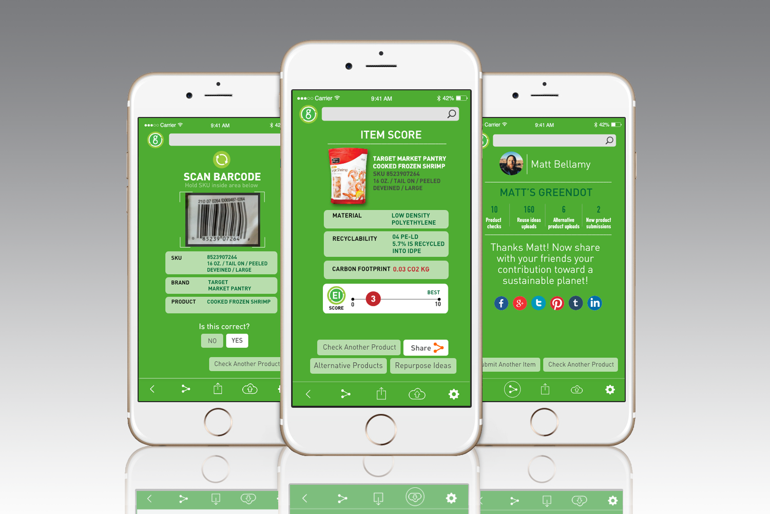 The app also offers users the opportunity to contribute to enlarge the database of rated products by submitting new products and, leveraging social media, connects them to a community of environmentally-minded folks who can share ideas about reusing and repurposing materials to reduce one's personal carbon footprint.