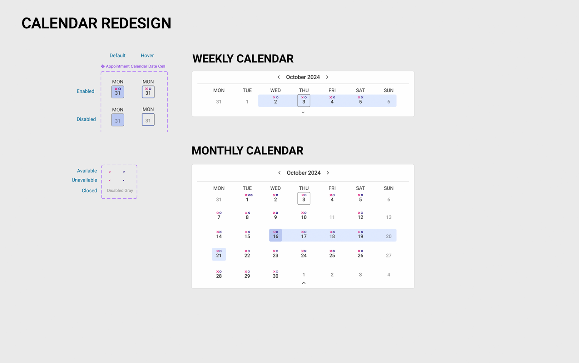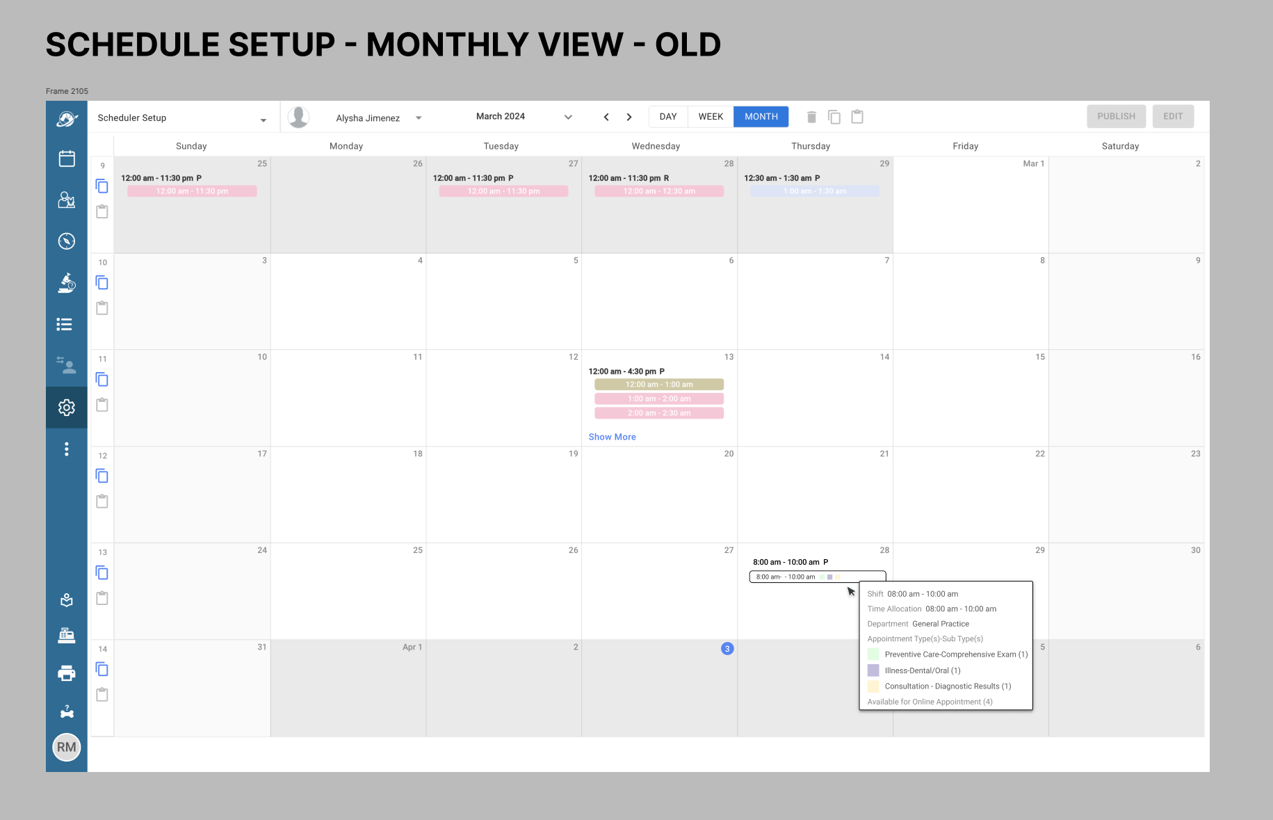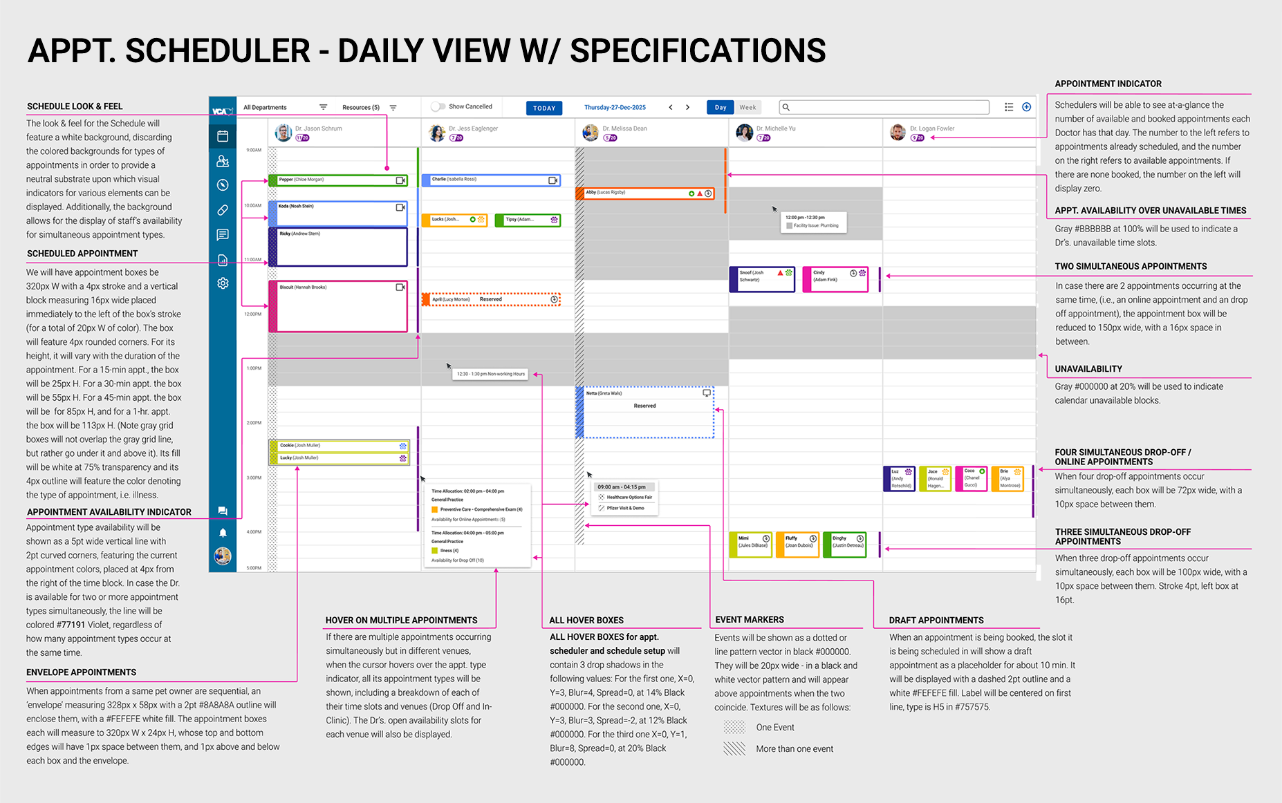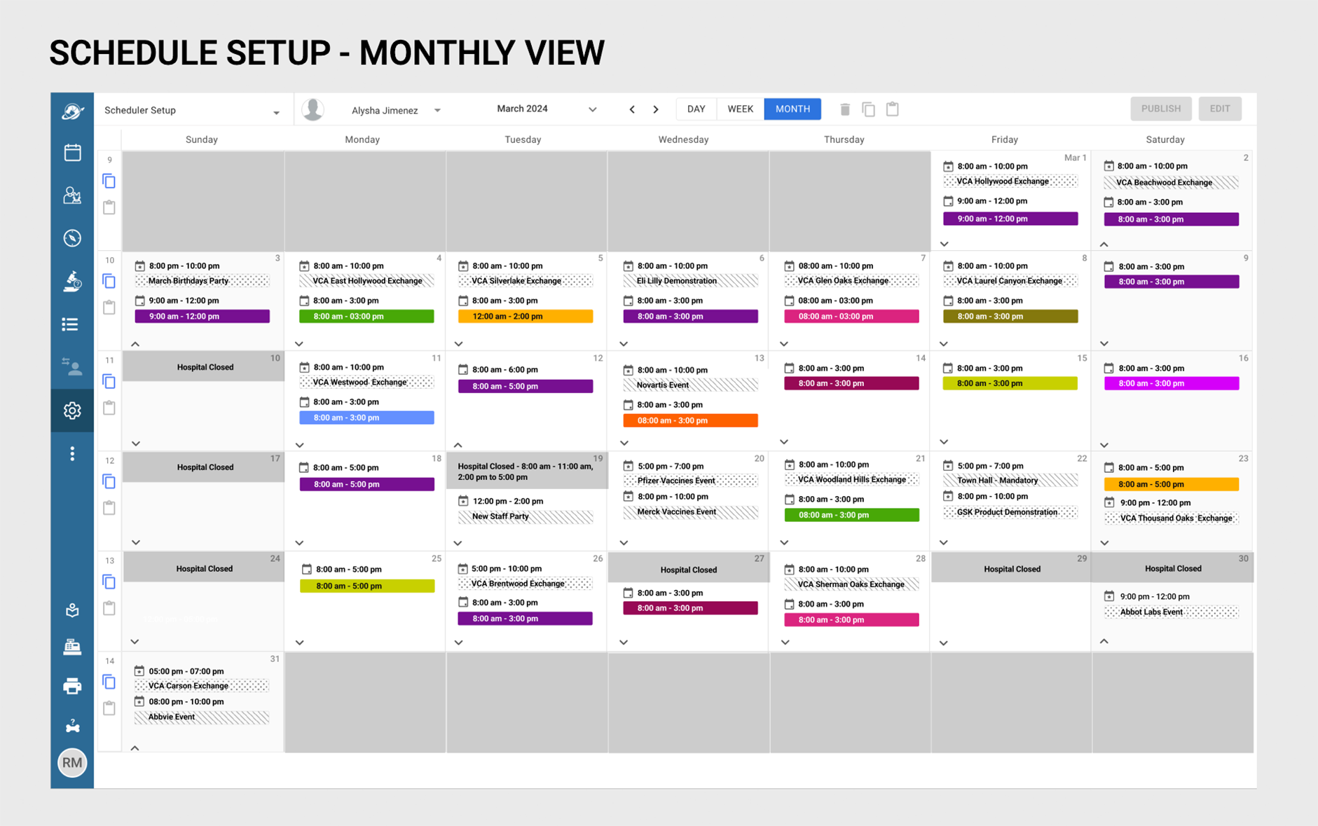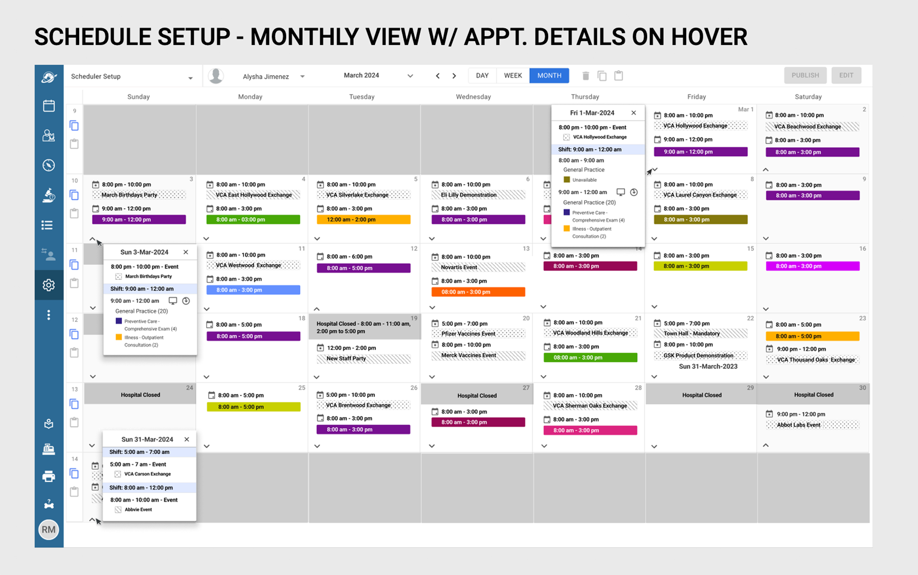 The Schedule Setup Monthly View revision was enhanced to feature both appointment type blocks as well as events per day, at a glance. By improving on contrast, using bold colors to designate appointment types, as well as indicating with iconography whether the owner would be present at the appointment, or if it would be a drop-off or whether it would be an online appointment.