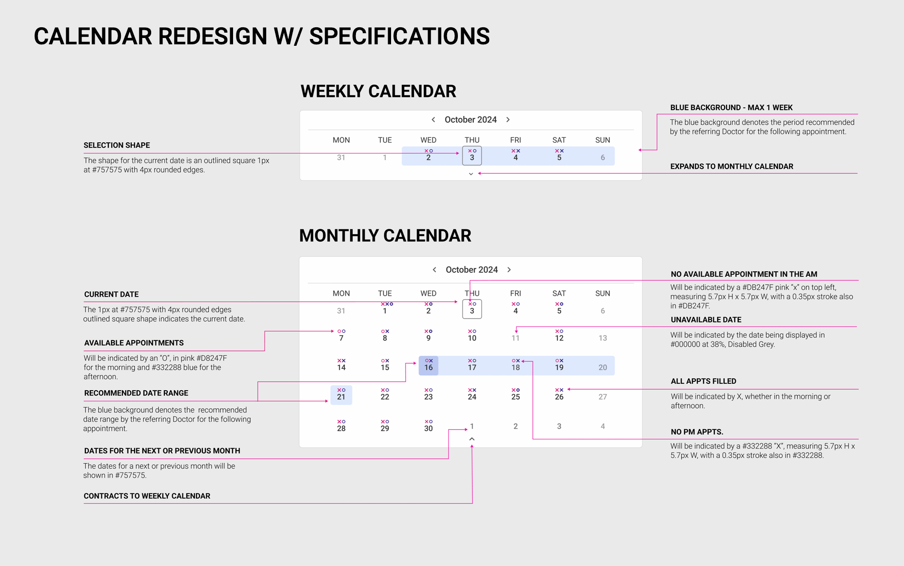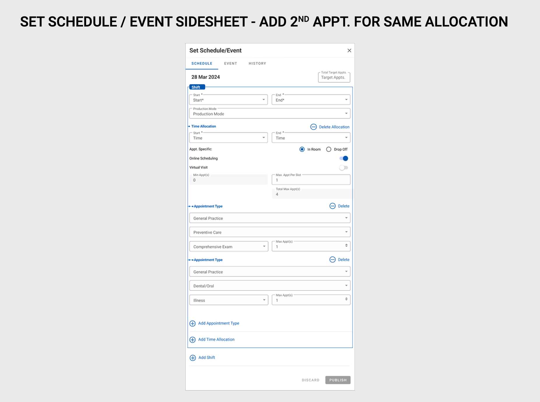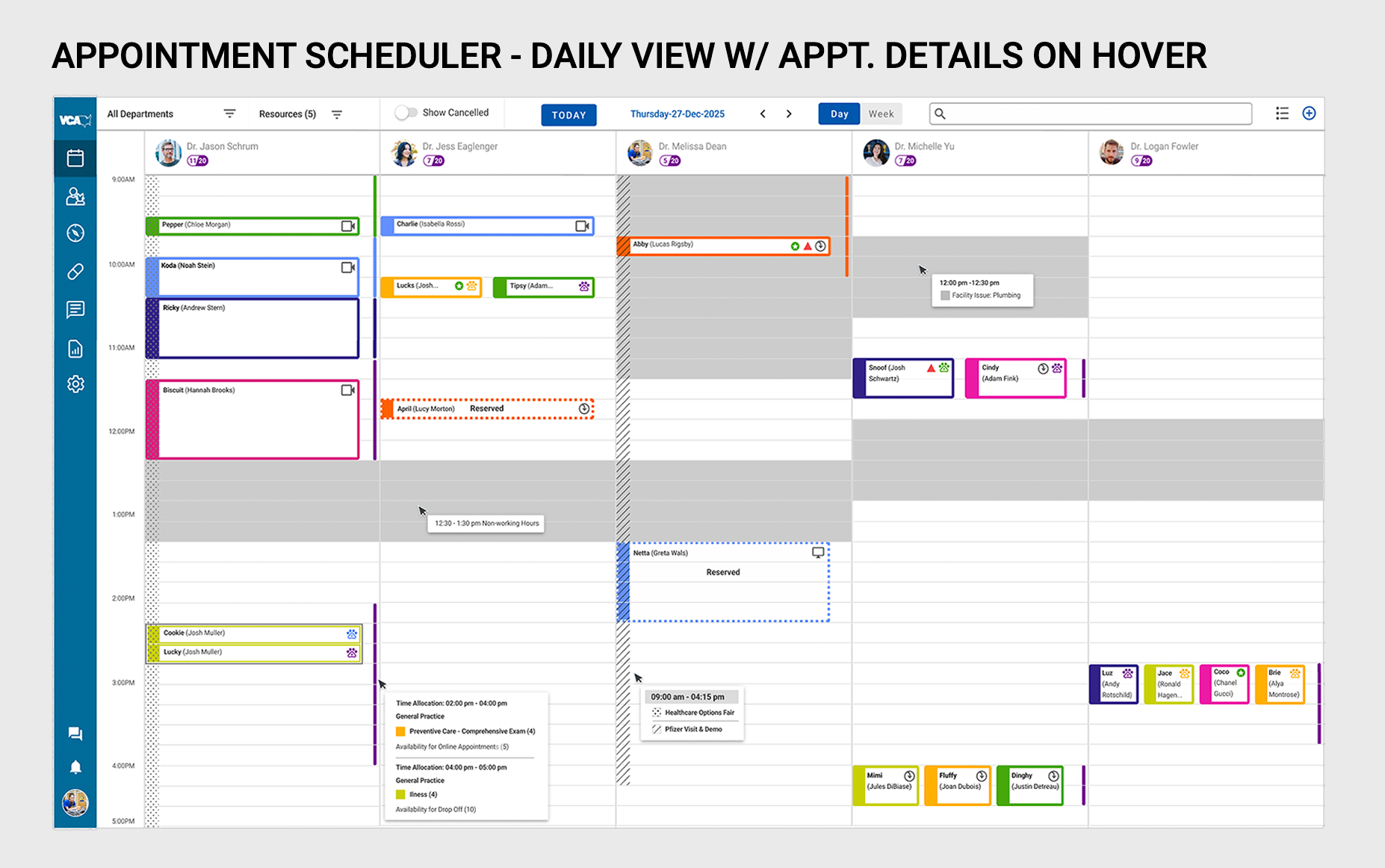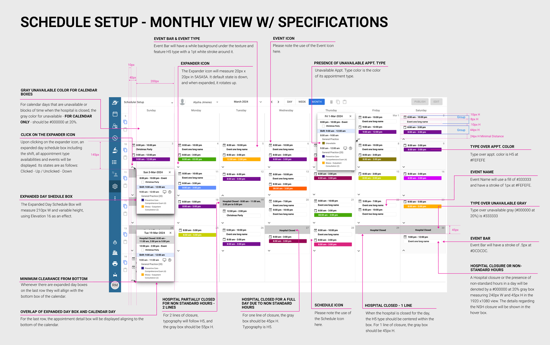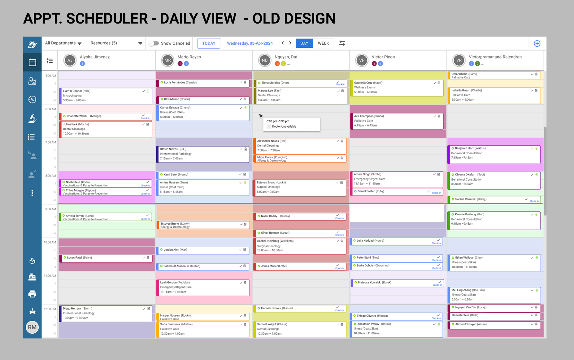 The Schedule Setup Monthly View revision was enhanced to feature both appointment type blocks as well as events per day, at a glance. By improving on contrast, using bold colors to designate appointment types, as well as indicating with iconography whether the owner would be present at the appointment, or if it would be a drop-off or whether it would be an online appointment.