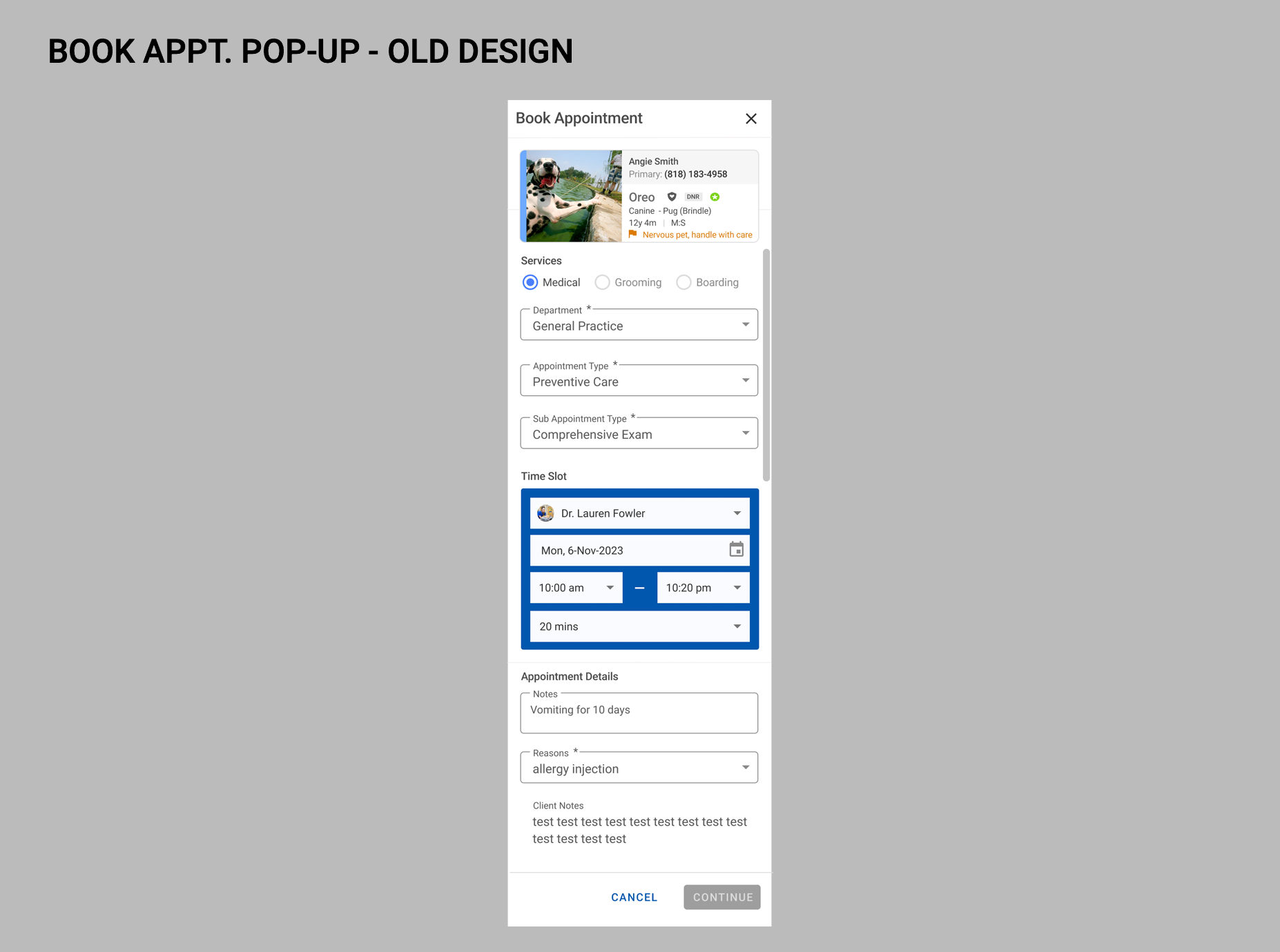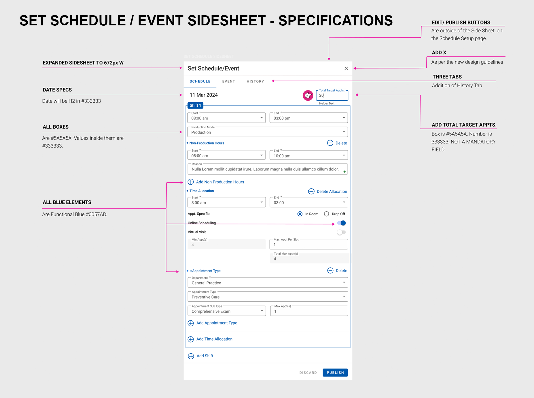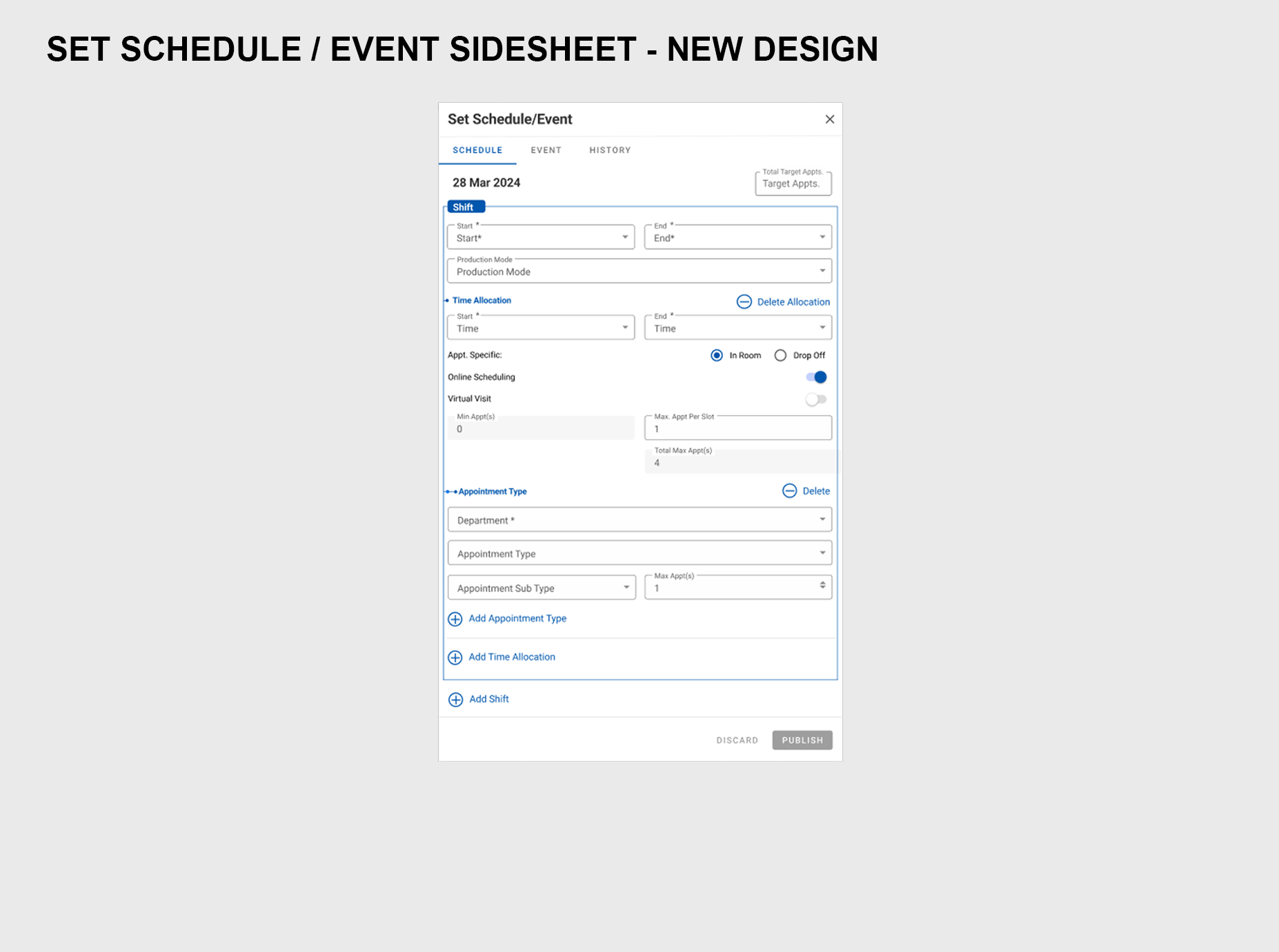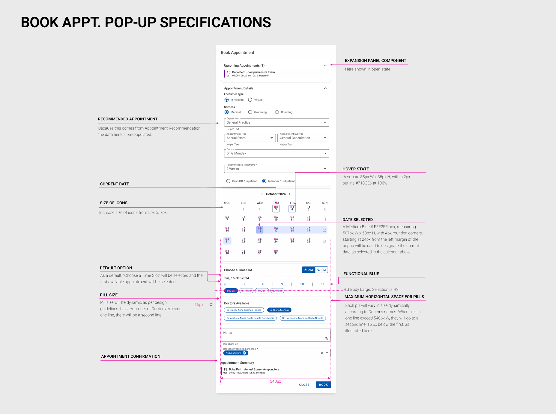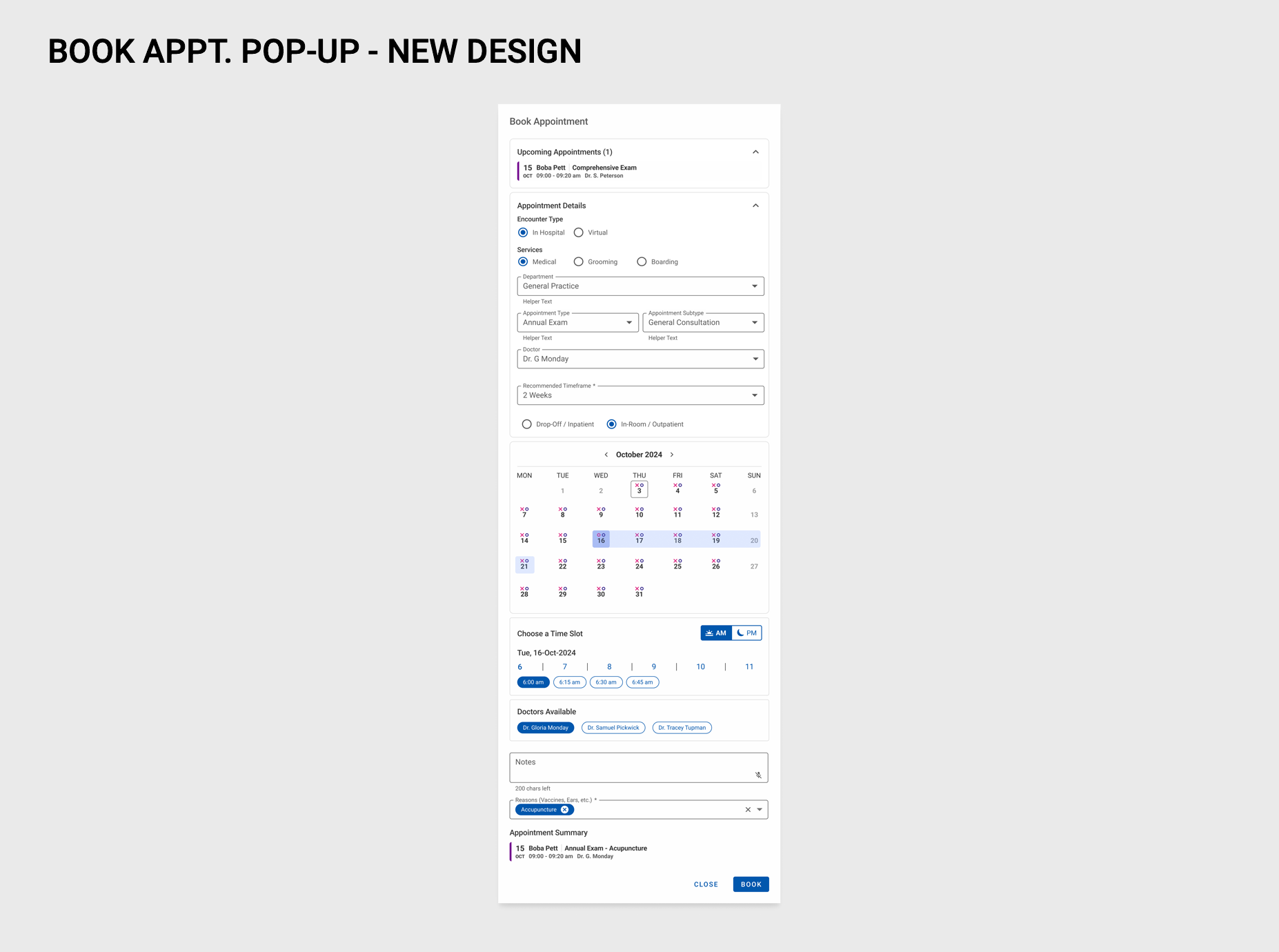 The Schedule Setup Monthly View revision was enhanced to feature both appointment type blocks as well as events per day, at a glance. By improving on contrast, using bold colors to designate appointment types, as well as indicating with iconography whether the owner would be present at the appointment, or if it would be a drop-off or whether it would be an online appointment.